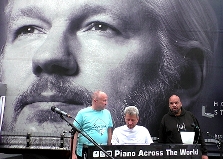 Arne Schmitt (Mitte) bei einer Veranstaltung zum 53. Geburtstag von Julian Assange, Wuppertal, 6. Juli 2024 (Aus NRhZ-Fotogalerie)