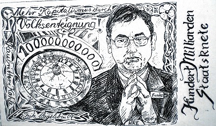 Nach der Finanzkrise 2007/8 entwickelte der Düsseldorfer Künstler Fritz Wegeleben mit den verbliebenen Protagonisten der ehemals lebendigen Fluxusszene die Aktion „Heuwagen-Aktien“ und „Banknutten“ und knüpfte damit auch an die ältere realistische politische Kunst eines Otto Pankok (1893-1966) oder Hans Kralik (1900-1971) an. Die „Heuwagen“-Aktien lehnten sich an das 1490 entstandene Triptychon „Der Heuwagen“ des niederländischen Malers Hieronymus Bosch (1450-1516) an und die „Banknutten“ an John Heartfields (1891-1968) Collage „Der Hitlergruß“ aus dem Jahre 1931. Die Aktion erhielt kaum mehr als regionale Aufmerksamkeit und die beteiligten Künstler wurden bewusst ignoriert und vergessen.