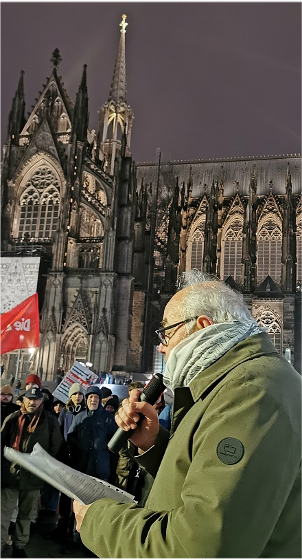 Peter Förster, aktiv im Kölner Friedensforum: Wie sollte ich eine Rede beginnen, vor dem Hintergrund, dass dieser Krieg sich nicht einfach nur richtet gegen eine Bewegung und eine Regierung, sondern er richtet sich gegen die Unterdrückten, gegen die Armen, die weltweit und gerade in Lateinamerika ihre Stimme erheben und sich anschicken, ihr Schicksal in die Hände zu nehmen