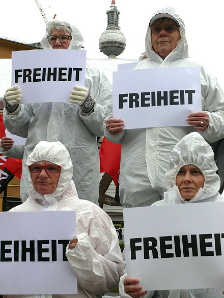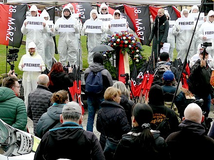 Sechs Jahre lag im März 2026 der Beginn einer von langer Hand geplanten Operation zurück, die die Welt – wie vor 25 Jahren die Operation 9/11 – verändert hat. Es war die Operation Corona, von der sich die meisten Menschen aufgrund ihrer unerwarteten Andersartigkeit überrumpeln ließen – doch nicht alle. Am 25. März 2020 wurde von Aachen aus eine Petition auf den Weg gebracht, mit der gezeigt wurde, dass die Lockdown-Maßnahmen jeglicher medizinischer Grundlage entbehrten (denn die Zahl der fiebrigen Atemwegserkrankungen war laut RKI zum Zeitpunkt des Lockdown-Beginns auf einem Tiefpunkt – niedriger als in den Wochen und auch in den Jahren zuvor), und mit der die unverzügliche Wiederherstellung der Grundrechte gefordert wurde – mit ca. 90.000 Unterzeichnern nach ca. zwei Monaten. Und drei Tage später, am 28. März 2020, waren es in Berlin Menschen wie Anselm Lenz, Hendrik Sodenkamp und Uli Gellermann, die sich keinen Bären aufbinden ließen, und auf dem Rosa-Luxemburg-Platz mit dem Grundgesetz in der Hand protestierten und damit auf die Brutalität des Staates stießen, der es nicht zulassen wollte, dass Menschen öffentlich zeigen, dass sie die Perfidie der Operation durchschauen. Am 28. März 2026 wurde dessen – sechs Jahre danach – mit Kundgebung, Demonstration Richtung Reichstag und Kranzniederlegung gedacht. Es war der Tag der Bewegung, der Gedenktag an die weltweit erste Demonstration gegen das Corona-Regime, der Gedenktag für die Impf-Opfer, der Gedenktag für die politischen Gefangenen in der BRD und der im Kampf um den Erhalt der Demokratie Gefallenen bzw. Getöteten. Zwei Arbeiterfotografen haben das Geschehen für die NRhZ dokumentiert.