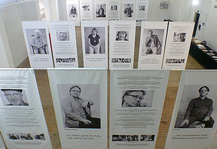 Hängung der dokumentierten Portraits in der Ausstellungshalle der Alten Feuerwache in Köln | Foto: Arbeiterfotografie