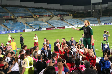 Als dann die neunte Lyoner Spielerin, die dunkelhäutige Stürmerin Élodie Thomis, an der Reihe war und beim 6:7 Spielstand für Potsdam zum Elfmeter antrat, hatte Potsdam mehr Glück als Verstand. Thomis traf nur die Querlatte. Die glückselige Anna Felicitas riss vor Freude die Arme hoch, tänzelte im Sekundenbruchteil auf der Stelle, um dann schnell laufend in die Mitte des Platzes, jubelnd verfolgt von ihrer gesamten Mannschaft, in den Mittelkreis zu rennen. „Das war wohl der Anfang einer großen Karriere“, bemerkte der französische UEFA Präsident Michel Platini mit italienischem Namen gegenüber dem DFB Präsidenten Dr. Theo Zwanziger. Deutschlands Frauenfußballförderer Nummer 1 „Theo überall“ noch ganz perplex: „Das wird nix mehr, dachte ich.“ Turbine-Ehrenmitglied Zwanziger sprang mit einem Jubelschrei hoch, umarmte UEFA-Präsident Platini und herzte jede Spielerin im Konfettiregen der Siegerehrung. Und weiter: „So was habe ich lange nicht mehr gesehen. Es war unglaublich, einfach fantastisch, so nervenaufreibend. Ich bin extrem stolz auf alle.“