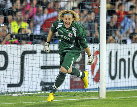 Olympique Lyon glaubte wirklich schon den Sieg in der Tasche zu haben, bis zu dem historischen Zeitpunkt als die nervenstarke Heldin Anna Felicitas Sarholz trotz vorangegangener Schussfehler ihrer erfahrenen Team-Gefährtinnen, Jennifer Zietz und Anja Mittag, mit zwei sicheren Paraden die Elfmeter-Schüsse von Amandine Henry und der frisch eingewechselten norwegischen Stürmerin Isabell Lehn Herlovsen (90.) hintereinander in die richtige linke Ecke flog und hielt.