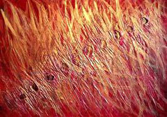 Der Betrachter verfolgt dabei den Verlauf der Farbfelder und Farbräume, Assoziationen, den Wechsel zwischen Zwei- und Dreidimensionalität. Die Farbschichten aus Acryl stehen stets in Einklang mit den Strukturen aus Modelliermasse, Pigmenten, Quark, Sand usw. - Ein Malprozess, der sich über viele Tage hinzieht.