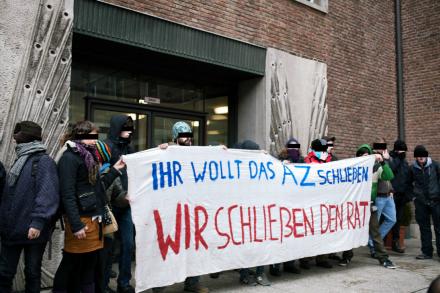 Während die PolitikerInnen von Kölns SPD, CDU, FDP und Grünen in einer öffentlichen Ratssitzung am 14. Februar die Kündigung des Vertrages mit den AZ-NutzerInnen beschlossen, den sie noch vor einem Jahr wegen der Auseinandersetzungen um das AZ in Kalk selbst einforderten, hielten jetzt bewaffnete Polizisten UnterstützerInnen mit Schlägen und Pfefferspray davon ab, Kritik im Rathaus zu äußern. Im Kölner Bürgerhaushalt 2011 hatte sich eine Mehrheit für den Erhalt des AZ ausgesprochen. Auch der Abriss der Kantine wurde von den Kalker BürgerInnen eindeutig abgelehnt.