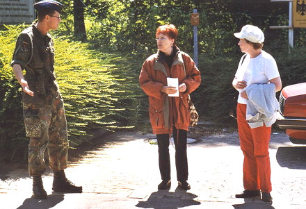 Obwohl es für die AktivistInnen schwer war, an die Soldaten heranzukommen, da zum Wochenende fast alle im Auto das Tor passierten, gelang es, einen dicken Packen von Flyern an die Adressaten zu bringen. Wer ohne Flyer weiterfuhr, sah wenigstens das Transparent der Kölner Paxan-Gruppe mit Hannah Arendts Satz "Kein Mensch hat das Recht zu gehorchen". Am Rande gab es interessante Gespräche. Der am Tor diensttuende Offizier schlug sogar vor, demnächst einmal ein Seminar mit Friedensleuten und Soldaten zum Thema Gehorsamsverweigerung zu organisieren. Als er jedoch gebeten wurde, die Verteilung des Flugblattes in der Kantine des Fliegerhorstes zu ermöglichen, wurde das von einem anderen hinzukommenden Militär entschieden verweigert.