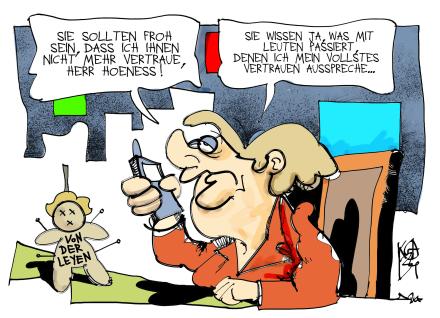 Angela Merkel, Gebetsmühle neokonservativer Glaubenssätze.- Sie seien strikt gegen einen „von Politikern festgelegten Einheits-Mindestlohn", sagten sie der BILD-Zeitung: "Viele Länder in Europa haben doch genau deshalb eine viel höhere Arbeitslosigkeit als wir, weil Löhne und Leistung bei ihnen zu weit auseinander klaffen." Ach ja? Soviel Fiktion leisten sich nicht einmal stockreaktionäre Ultras wie Dieter Hundt oder Olaf Henkel. Aus Ihrem Munde immerhin ein Hinweis darauf, was bei Ihnen auseinander klafft, unüberbrückbar: Ihre Empathie-Unfähigkeit gegenüber ausgebeuteten Mitmenschen mit Stundenlöhnen unter fünf Euro einerseits – und andererseits Ihre Rolle als „Kanzlerin der Herzen“, die Springers BILD Ihnen andichtet. (PK)
