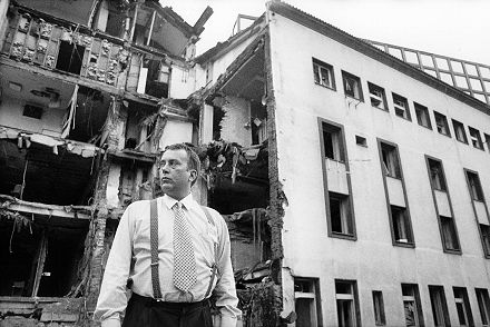 Prof. Miodrag Lazic vor der zerstörten neurologischen Klinik im Krankenhaus Dr. Dragisa Misovic, Belgrad: „Ich war in der Nacht, als das Krankenhaus bombardiert wurde, hier – wie in jeder Nacht während des Krieges. Es war eine schreckliche Nacht. Der erste Gedanke war, den Betroffenen zu helfen. Es war furchtbar, die toten Patienten zu sehen, Menschen voller Angst, um Hilfe rufende Mütter mit ihren schreienden Kindern.“