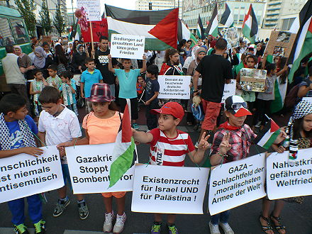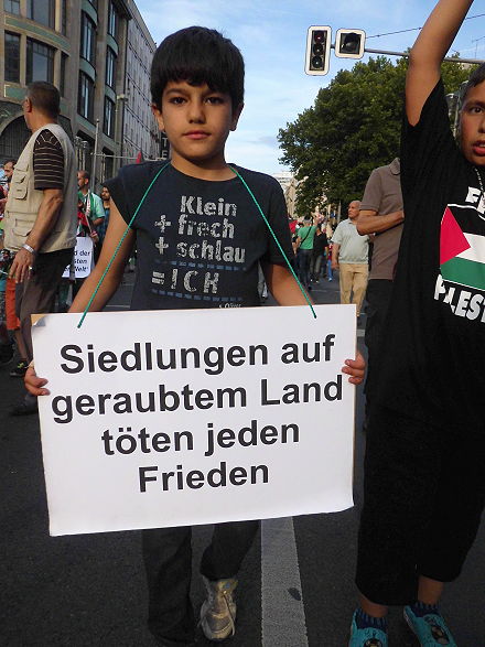Das feige israelische Massaker an der fast wehrlosen, gefangen gehaltenen Bevölkerung des Gaza-Streifens mit der weitgehenden Zerstörung der Infrastruktur geht Tag für Tag weiter, ohne dass die so genannte westliche Wertegemeinschaft – wie sich der imperialistische Machtraum mit den USA und ihren Verbündeten bzw. Vasallen nennt – dagegen irgendwelche ernst zu nehmenden Schritte unternehmen würde. Statt Täter und Mittäter in Politik, Militärapparat und Medien vor Gericht zu stellen und zu langjährigen Haftstrafen zu verurteilen und das Existenzrecht für alle Menschen in Palästina zu fordern und durchzusetzen, ist vom "Selbstverteidigungsrecht" des Täters die Rede. In dieser Situation kommt es immer häufiger zu Protesten. Am 1. August 2014 rief in Berlin die palästinensische nationale Arbeitskommission zu einem Protestmarsch gegen die israelische Aggression im Gazastreifen auf. Aber nicht nur Palästinenser kamen – auch die Jüdische Stimme für gerechten Frieden in Nahost.