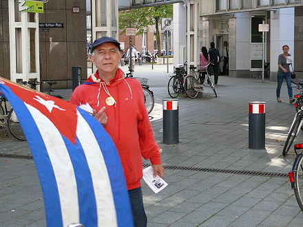 „Für die Durchführung eines Solidaritäts- und Aktionstages am 12. September anlässlich des 16. Jahrestages der Inhaftierung der MIAMI 5 hatte sich im Rhein-/Ruhrgebiet ein Aktionsbündnis zusammengetan, bestehend aus: Bundesverband Arbeiterfotografie, Freundschaftsgesellschaft BRD-Kuba e.V. – Bundesvorstand und Regionalgruppen Essen und Köln, DKP Cuba-AG, DKP Düsseldorf, Solidaritätskomitee Basta Ya und VVN/BdA Düsseldorf. Die Solidaritätsveranstaltung, die in der NRW-Landeshauptstadt von 11 bis 17 Uhr unmittelbar gegenüber dem US-Generalkonsulat durchgeführt wurde, fand in einer ausgesprochen kämpferischen Atmosphäre statt. Zu jeder vollen Stunde wandte sich der Moderator namens der Anwesenden über die Lautsprecheranlage direkt an den US-Generalkonsul Stephen A. Hubler und klagte dabei die USA des Terrorismus an. Hubler wurde aufgefordert, sich als Austauschgeisel für die als politische Geiseln festgehaltenen cubanischen Gefangenen oder zumindest für eine öffentliche Diskussion zur Verfügung zu stellen. Erwartungsgemäß gab es keine Reaktion seitens des Diplomaten, der laut Veranstalter immerhin einen Staat repräsentiere, der wöchentlich per Joystick mit unbemannten Drohnen Menschen umbringe und sich dabei als Ankläger, Richter und Henker in einem betätige. Das Aktionsbündnis, das während des gesamten Tages mit hunderten Flugblättern und in vielen Gesprächen direkt mit der Düsseldorfer Bevölkerung in Kontakt trat, sammelte zahlreiche Unterschriften unter ein an Obama gerichtetes Plakat 'Obama – Give me Five!' und unter eine Petition an den US-Generalkonsul. Die Veranstalter schätzen den Aktionstag als Erfolg ein und versichern dem US-Generalkonsul, in ihrem Kampf nicht nachzulassen, bis auch der letzte der noch inhaftierten drei Cubaner wieder zurück bei seinen Familien in Cuba sei.“ So heißt es in einem Kurzbericht der Veranstalter über den Solidaritäts- und Aktionstag für die MIAMI 5 in Düsseldorf.