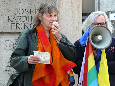 Protest gegenüber dem Rathaus: „Klitschko, hau ab! Deine Faschistenfreunde warten auf dich in Kiew.“