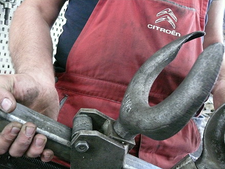 KFZ-Meister Marko Kandzija mit ca. 25 Kilogramm schwerem Federspanner, ist nach dem Umzug der neue Geschäftsführer von Auto-Strasser