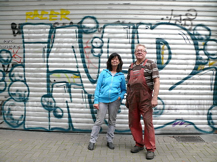 Dorothea und Theo Puchelski vor dem geschlossenen Tor der Zufahrt zur Werkstatt. Über 40 Jahre Lebenszeit spielten sich hier ab.