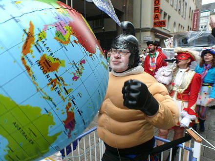 Das ist ein gefährlicher Kampf, auf den sich eine Gruppe von Menschen in Köln eingelassen hat. Sie kämpfen auf allen Ebenen gegen den braunen Sumpf. Und sie scheuen sich nicht, den Kern des Übels ins Visier zu nehmen – das perverse System, das sich zu behaupten sucht und dabei unseren Erdball zu zerstören droht – das System, das Kapitalismus genannt wird und das, wenn es dies für notwendig erachtet, Rassismus und Faschismus gebiert. "Bunte Funken jäje braune Halunken – Mer stelle alles op de Fööss" - Das war das Motto der Pappnasen Rot-Schwarz beim Kölner Rosenmontagszug am 8. Februar 2016. "Bunte Funken gegen braune Halunken – Wir stellen alles auf die Füsse." Hinter einer Fassade von Organisationen und Bewegungen, die zur Ablenkung geschaffen sind, geben die Pappnasen den Blick frei auf den "Global Player". Welche Farbe hat er? Was für eine Frage: braun. Das Kapital ist im Zweifel braun.