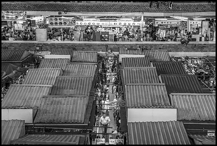 Der Markt hat mehrere Ebenen - mit großen offenen Bereichen, umgeben von Balkonen mit Restaurants. Unten befinden sich die Verkaufsstände mit ihren Metalldächern, durchzogen von den Gängen zwischen ihnen.