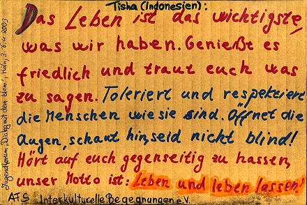 614. Thisa (Indonesien): Das Leben ist das Wichtigste, was wir haben. Genieße es friedlich, und traut euch, was zu sagen. Toleriert und respektiert die Menschen, wie sie sind. Öffnet die Augen, schaut hin, seid nicht blind! Hört auf, euch gegenseitig zu hassen. Unser Motto ist: Leben und leben lassen!
