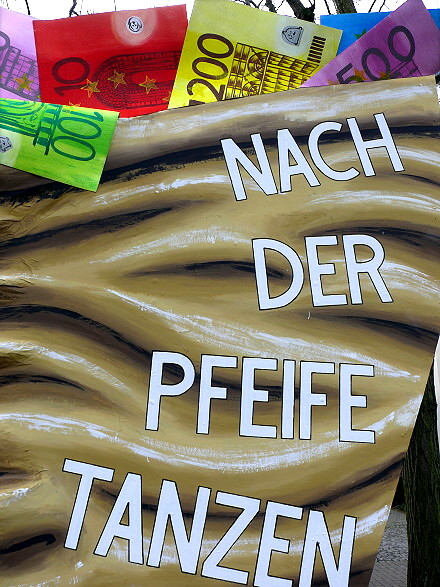 „Mer Kölsche danze us der Reih" (Wir Kölner tanzen aus der Reihe). So lautet das Motto des Kölner Rosenmontagszugs 2018. Er widmet sich mit einem Todestanz dem Bienensterben, mit einem letzten Tango dem Überlebenskampf der Eisbären und mit einem Wagen, auf dem steht „Nach der Pfeife tanzen“ der Macht des großen Geldes. Die Kölner Pappnasen Rot-Schwarz, die dem Zug voranschreiten, greifen das offizielle Motto auf: „mer danze us der Reih“ (Wir tanzen aus der Reihe) und ergänzen: „Mer klääve nit am Wachstumswaahn“ (Wir kleben nicht am Wachstumswahn). Doch das alles ist zu schön um wahr zu sein. Ein Trupp des Kapitals hat sich des Rosenmontags bemächtigt. Er hat den Kölner Straßenkarneval am Montag, dem 12. Februar 2018, in eine Demonstration für das Europa der Banken und Konzerne verwandelt. Und das Undenkbare passiert: sogar Polizei demonstriert mit. „Pulse of Europe“ hatte zugeschlagen und Tausende von EU-Fähnchen verteilt. Das US-Imperium hat mit der Schaffung der EU große Teile Europas gekapert. Werner Rügemer macht deutlich: US-Statthalter in der EU wurde die BRD (siehe Anhang). Und nun hat diese EU den Kölner Karneval gekapert.