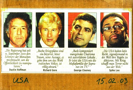 1758. Dustin Hoffman: „Die Regierung hat seit 11. September 2001 den Schmerz der Menschen missbraucht, um die Öffentlichkeit zu manipulieren.“ Richard Gere: „Bushs Kriegspläne sind ein bizarrer, böser Traum, seine Aussage, es gehe ihm nur um das Wohl des irakischen Volks, ist völlig absurd.“ George Clooney: „Bush kompensiert mangelndes Charisma mit autoritärem Gehabe. Er leitet die USA wie die Mafiafamilie der Sopranos im TV.“ Spike Lee: „Die USA haben kein Recht, irgendjemand in der Welt ihre Regeln zu diktieren. Mit Krieg schafft man Terror nicht aus der Wetl.“