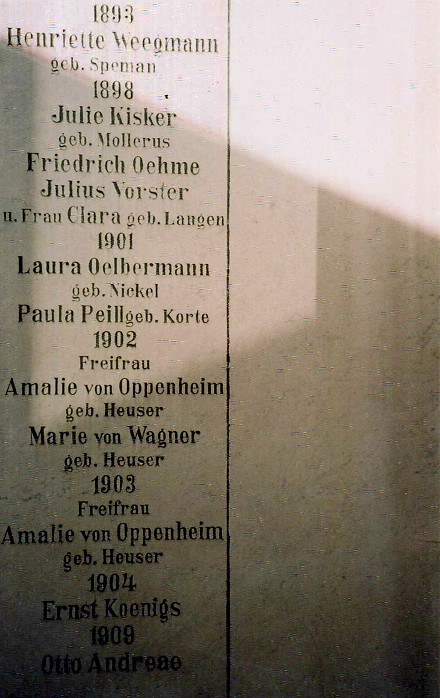 In der großen Monografie über die Gedächtniskirche (7) ist die Oelbermann-Tafel zwar mehrfach zu sehen (S. 191, 244 und 273), doch taucht Lauras Name nicht im Personenregister auf. Dass Laura Oelbermann sich in der bedeutungsträchtigsten wilhelminischen Kirche verewigen konnte, spricht für die Wertschätzung, die ihr seitens des Kaiserpaars entgegengebracht wurde. Wie in Jerusalem hat Laura sich diese Wertschätzung auch in Berlin nicht ohne harte Währung erworben: Sie war es, die die Mosaizierung der Vorhalle finanzierte! Diese Mosaiken sind, nur leicht lädiert, erhalten. Laura wird als „Stifterin“, aber nicht mit Namen genannt (14, S. 28). Ihre Tafel wurde elf Jahre nach der Einweihung der Kirche angebracht; die gesamte Innendekoration der Vorhalle wurde erst zu dieser Zeit fertig. Worauf weist das Datum „27.2.1906“ hin? Es war der Tag der Silberhochzeit (7, S. 331) des Kaiserpaars. Und so kam es, dass die Berliner Kirche auch eine Oelbermannsche „Gedächtniskirche“ wurde – für eine Familie aus Köln! (Umgekehrt befindet sich seit 1966 auch ein Stück der Berliner Kirche in Köln: und zwar der Kopf eines Petrus-Mosaiks im Brunnen vor der Oper. Siehe auch: www.udo-w-hombach.de Rubrik Opernbrunnen.)