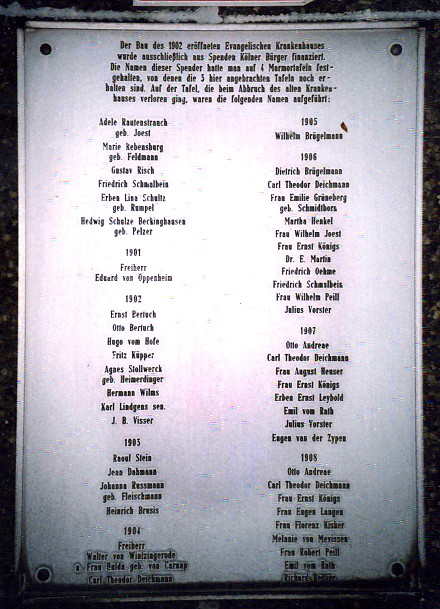 Zur inneren Einrichtung gehörte eine „Kapelle. Stifterin: Frau E. Oelbermann“ (2, S. 31). Das Krankenhaus „liegt im Südwesten Cölns, etwa 10 Minuten vom mittleren Teile des Hohenstaufenrings [wo die Oelbermann-Villa stand]. Es grenzt südöstlich [eigentlich im Süden] an den … alten evangelischen Friedhof, welcher als Parkanlage hergerichtet, jetzt den Rekonvaleszenten zu Spaziergängen dient“ (2, S. 11).