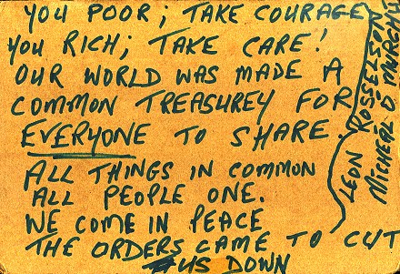1948. Ihr Armen, fasst Mut. Ihr Reichen, passt auf! Unsere Welt wurde zu einem gemeinsamen Schatz gemacht, den alle teilen können. Alle Dinge gemeinsam, alle Menschen eins. Wir kommen in Frieden. Die Befehle kamen, um uns niederzumachen.