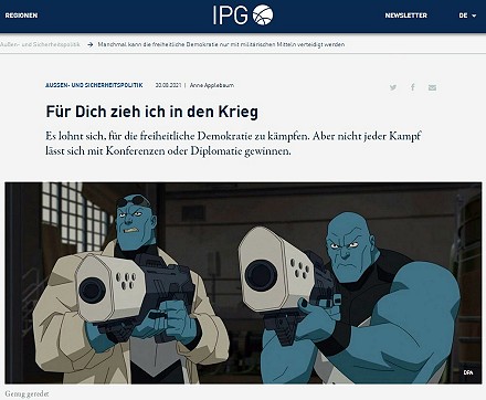 Am 30. August 2021 – einen Tag vor dem definitiven Abzugstermin der USA in Afghanistan – erschien im ipg-journal der Friedrich-Ebert-Stiftung (SPD) der für "The Atlantic" schreibenden Autorin Anne Applebaum der kriegsbefürwortende Artikel "Für Dich zieh ich in den Krieg". Vorangestellt war das Bild mit der Unterschrift: "Genug geredet". Das ipg-journal versteht sich „als engagierte Debattenplattform für Fragen internationaler und europäischer Politik. Wir wollen nicht nur beschreiben, sondern auch Impulse geben durch kritische Interpretationen und Bewertungen. Das Themenspektrum umfasst außen-, sicherheits-, und entwicklungspolitische Fragen ebenso wie Herausforderungen der europäischen Integration und globale Umweltfragen.“ (1)(2)