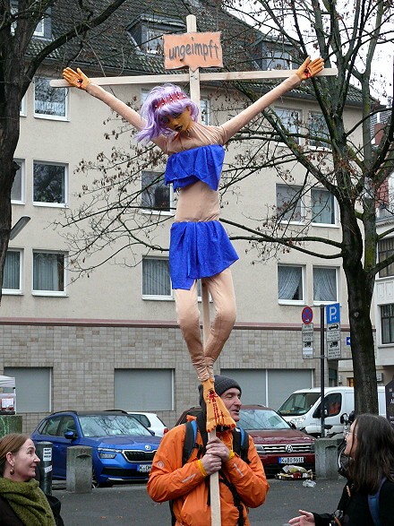 Es war eine Demonstration unter dem Motto "Massenhypnose, Great Reset und Impf-Faschismus? Ohne uns!" für die Wiederherstellung der Grundrechte, für Menschlichkeit und gesundes Leben, für ein ganzheitliches biologisches Medizin-Verständnis, für ein Ende der Pandemie der Lügen und Nötigungen, gegen die Verleugnung des Offensichtlichen, gegen Impfapartheid und Impfpflicht, die am 18. Dezember 2021 in Köln stattgefunden hat. Der Protest begann auf dem Wilhelmplatz im Stadtteil Nippes, als der Markt, der dort täglich außer sonntags stattfindet, noch abgebaut wurde – begleitet von Gegenprotest und Störaktion der BillGantifa – und endete nach einer Demonstration durch den Stadtteil Nippes und die Kölner Innenstadt am Rhein unterhalb des Kölner Doms. Die NRhZ dokumentiert den Protest in Fotos der Arbeiterfotografie.