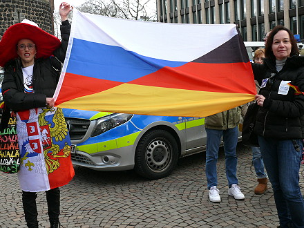 Wie wird über die Aktionen am 24. Februar 2024 in Köln berichtet? Ein paar Kostproben: "Vor zehn Jahren begannen die Angriffe der Ukraine auf seine eigene Bevölkerung im Donbass – und bis heute herrscht Krieg." Ist das ein Zitat, mit dem über den 24. Februar berichtet wird? Nein, das Zitat lautet anders: "Vor genau zwei Jahren griff Russland sein Nachbarland Ukraine an – und bis heute herrscht Krieg." Es stammt aus dem "Express". "Mittels Lautsprecher brüllte die Oberbürgermeisterin Reker über den Roncalliplatz." Ist das ein Zitat, mit dem über den 24. Februar berichtet wird? Nein, das Zitat lautet anders: "Mittels Lautsprecher brüllten Kolbasnikova und Beisicht über den Rudolfplatz." Es stammt von "report-k". "Wenn jetzt nicht alle Kräfte und Ressourcen in Europa mobilisiert werden, um das Eintreten für Frieden durch Verhandlungen zu unterstützten, könnte der perfide Plan der NATO doch noch aufgehen, die Ukraine vollständig einzunehmen und damit der vollständigen Beherrschung Eurasiens deutlich näher zu kommen." Ist das ein Zitat, mit dem die Situation am 24. Februar 2024 beschrieben wird? Nein, es ist folgendes zu lesen: "Wenn jetzt nicht alle Kräfte und Ressourcen in Europa mobilisiert würden, um die Ukraine in ihrem Verteidigungskampf zu unterstützten, könnte der perfide Plan Putins doch noch aufgehen, die Ukraine vollständig einzunehmen." Mit diesem Satz gibt das "Dom-Radio" eine Passage der Organisation "Blau-Gelbes Kreuz" wieder, mit der für die Teilnahme an der Kriegspropaganda-Veranstaltung auf dem Roncalliplatz geworben wird.