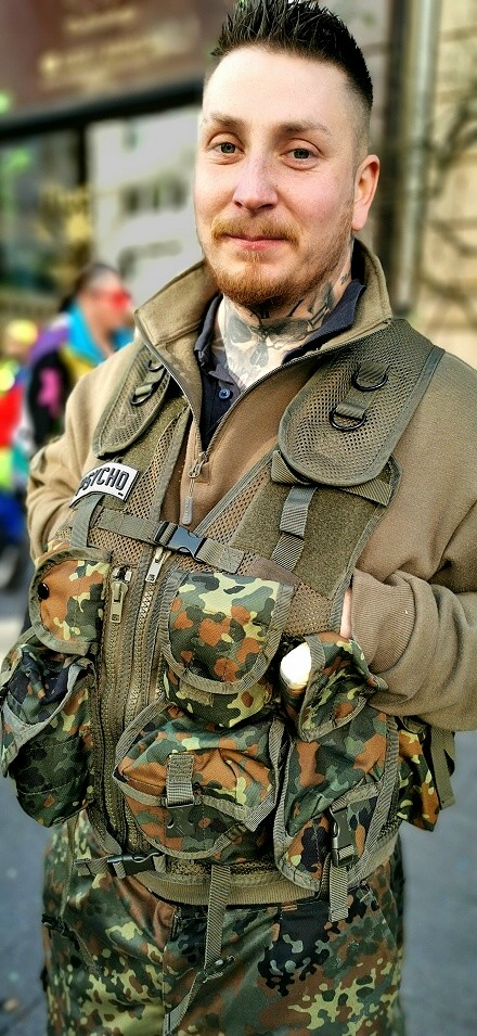 01 Nit scheeße! Krieg oder Frieden? Für diese Regierung würde ich nicht in den Krieg ziehen.. und überhaupt nur zur Landesverteidigung. Ist das „Kostüm“ echt? Ja, es stammt aus einem US-army-shop…(Alle Fotos: Arbeiterfotografie)