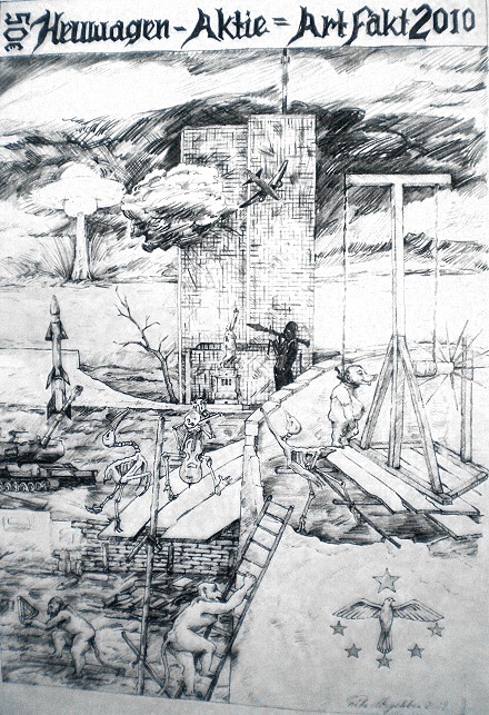 Nach der Finanzkrise 2007/8 entwickelte der Düsseldorfer Künstler Fritz Wegeleben mit den verbliebenen Protagonisten der ehemals lebendigen Fluxusszene die Aktion „Heuwagen-Aktien“ und „Banknutten“ und knüpfte damit auch an die ältere realistische politische Kunst eines Otto Pankok (1893-1966) oder Hans Kralik (1900-1971) an. Die „Heuwagen“-Aktien lehnten sich an das 1490 entstandene Triptychon „Der Heuwagen“ des niederländischen Malers Hieronymus Bosch (1450-1516) an und die „Banknutten“ an John Heartfields (1891-1968) Collage „Der Hitlergruß“ aus dem Jahre 1931. Die Aktion erhielt kaum mehr als regionale Aufmerksamkeit und die beteiligten Künstler wurden bewusst ignoriert und vergessen.So findet man im Internet keinen Wikipedia-Eintrag zu Fritz Wegeleben, allerdings Hinweise zu einigen seiner Werke, die auch noch gehandelt werden. Demnach wurde er 1941 geboren, absolvierte eine Elektrikerlehre und arbeitete auch 15 Jahre in diesem Handwerk, u. a. als Theaterbeleuchter am Nationaltheater Mannheim. Danach ging er nach Düsseldorf, wirkte auch kurzfristig als Bühnenvolontär, um den Lockrufen eines Joseph Beys (1921-1986), der von der Kunstakademie Düsseldorf aus sein wildes Treiben als öffentlicher Aktionskünstler inszenierte, zu folgen. Wegeleben bemühte sich jedoch ernsthafter und galt als Meisterschüler von Rolf Sackenheim (1921-1986), einem abstrakt arbeitenden Grafiker und Maler, der u. a. auf der documenta kassel 1959 ausstellte. Von ihm inspiriert zeigt sich sein Malstil von den 70er bis zu 90er Jahren. Später arbeitete Fritz Wegeleben auch mit Anatol Herzfeld (1931-2019), Bildhauer und Schmied, dessen Eisenskulpturen im Atelier auf der Insel Hombroich bei Neuss angefertigt wurden und dort auch stehen, zusammen.