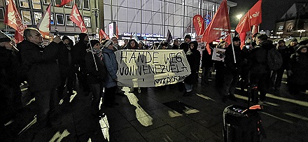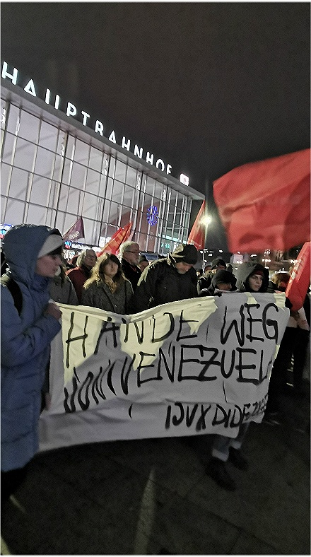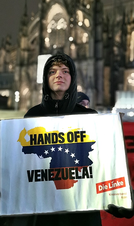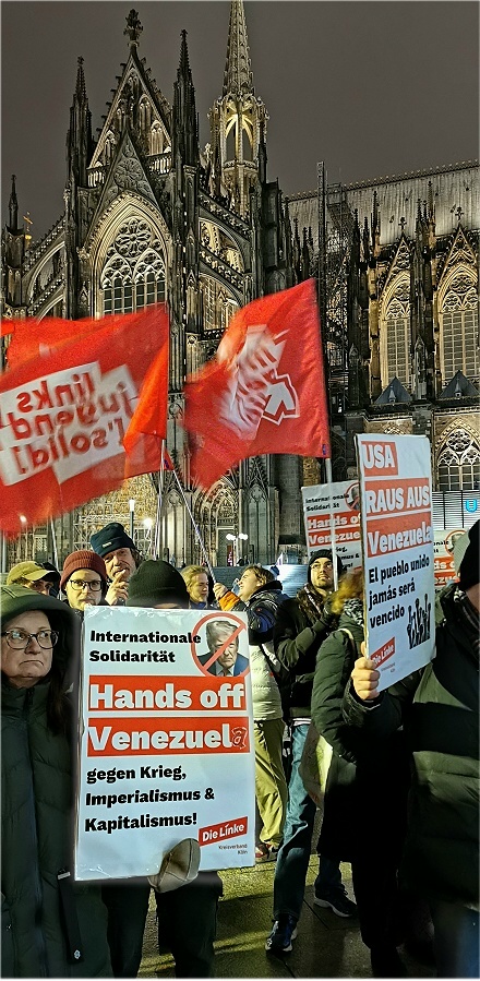 Wer die Geschichte verfolgt, selbst Zeuge wurde oder sich die Zusammenhänge klar macht staunt nicht schlecht über den plumpen Bombenangriff der USA auf das südamerikanische Venezuela am 3. Januar 2026, getoppt durch die Entführung des Präsidentenpaares Nicolas Maduro und seiner Ehefrau… Dabei bietet der Baukasten des Regime Change doch die schillerndsten Methoden von der verdeckten Operation bis hin zum dschihadistisch lancierten Aufstand zuletzt in Syrien. Mit dem 2001 ausgerufenen „War on Terror“ durch George W. Bush projektierten die USA die Umstürze in sieben Ländern des Nahen und Mittleren Osten: Irak, Libyen, Syrien, Sudan, Somalia, Libanon und schließlich Iran. Die damalige US-Außenministerin Condoleeza Rice sprach von „Geburtswehen im Nahen Osten“, Teil der NWO-New World Order-Strategie. Von wiedererkennbaren Mustern spricht die Journalistin und Nah-Ost-Expertin Karin Leukefeld: zunächst Sanktionen, darauf folgende Volksunruhen, und schließlich der Einmarsch von Dschihadisten wie in Syrien so jetzt im Iran. Was aber hat Venezuela ins Fadenkreuz gebracht. Ohne Frage geht es um Aneignung von Rohstoffen und geostrategischen Positionen. Es geht um die Ausschaltung des politischen Systemgegners, dem „Gespenst des Kommunismus“, das beim Putsch in der „Bananenrepublik“ Guatemala durch die PR-Strategien eines Edward Bernays scheint‘s unauslöschlich in die Hirne gepflanzt wurde. Wer also heute vom „Regime Maduro“ meint sprechen zu müssen, bedient – unwissend oder bewusst – die PR der Umstürzler.Nicht zuletzt konfrontierten die Demonstrierenden vor dem Kölner Dom Deutschland und die EU mit ihrer Doppelmoral. So die Sprecherin von DIDF: „Die gleichen Politiker, die in endlosen Reden territoriale Integrität der Ukraine beschwören, massiv aufrüsten und auch darüber nachdenken, Soldaten zu schicken, schauen weg, wenn ein lateinamerikanisches Land überfallen wird.“ Dieses Verhalten sei kein Fehler sondern gehöre zur Programmatik. Was aber ist der „Sündenfall“ Venezuelas, außer, dass es dem westlichen Hegemon und Anspruchsteller widerspricht? Sündenfall Nr. 1: Venezuela hat sich stets gegen den Genozid in Gaza ausgesprochen und die Palästinenser mit allen Mitteln unterstützt… und Sündenfall Nr. 2: Venezuela verkauft Öl an US-Konkurrent China.