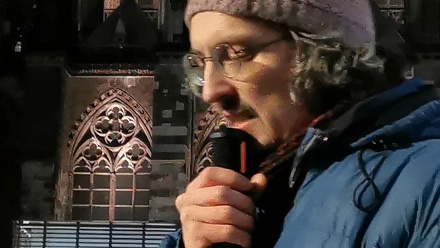 Peter Förster, aktiv im Kölner Friedensforum: Wie sollte ich eine Rede beginnen, vor dem Hintergrund, dass dieser Krieg sich nicht einfach nur richtet gegen eine Bewegung und eine Regierung, sondern er richtet sich gegen die Unterdrückten, gegen die Armen, die weltweit und gerade in Lateinamerika ihre Stimme erheben und sich anschicken, ihr Schicksal in die Hände zu nehmen