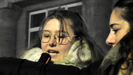 Sprecherin int. Jugendverband IJV: Als internationaler JV sind wir heute auch hier, weil die Kämpfe der Jugend sehr maßgeblich für die Frage des Friedens und der Solidarität auf der Welt sind. … Noch nie hat ein imperialistischer Krieg Sicherheit und Demokratie bedeutet.