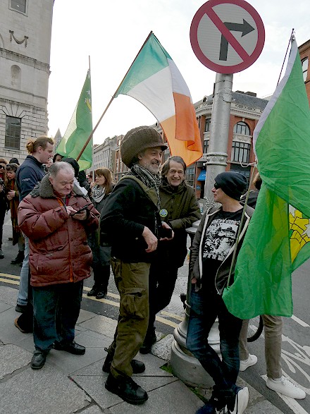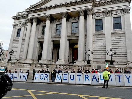 Gathering vor dem City Council in Dublin: «Dublin for Neutrality». Am Tag nach der Kundgebung erfolgte der Beschluss, des County of Dublin, den Tripple Lock bei zu behalten.
